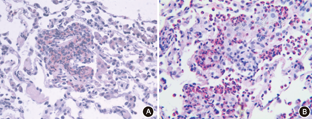共得到28份病理结果。病理分别取自肺、皮肤、鼻腔黏膜、淋巴结、肾脏、消化道、唇腺,其中病理表现为血管外嗜酸性粒细胞浸润26例(92.9%)、肉芽肿3例(10.7%)、血管炎1例(3.6%)。有1例肾衰患者肾组织活检可见血管炎、嗜酸性粒细胞浸润与肉芽肿3种病理类型同时存在。肺组织主要病理学表现见图2。
