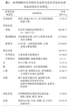 30例嗜酸性肉芽肿性多血管炎患者系统性表现及临床特征分布情况