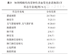 (1)血液学检查:患者外周血嗜酸性粒细胞百分比为(21.6±15.2)%,其中23例(76.7%)>10%,7例之前曾使用过糖皮质激素(简称激素)。外周血嗜酸性粒细胞绝对值中位数为1.45×109/L,最高达6.40×109/L。30例患者均进行ANCA检测,其中3例(10.0%)阳性,均为p-ANCA阳性;有2例表现为髓过氧化物酶(MPO)抗体阳性,这2例中1例为肾脏累及,1例为肺部累及;另1例MPO及PR3(蛋白酶3)抗体均阴性,出现多发神经病变。其他化验结果见表2。(2)肺功能检查:18例行肺功能检查,8例阻塞性通气功能障碍,3例混合性障碍,7例弥散功能障碍,5例小气道功能障碍;另外支气管舒张试验阳性2例,支气管激发试验阳性3例。(3)诱导痰检查:16例行诱导痰检查,诱导痰中嗜酸粒细胞(47.1±25.0)%(范围:10.0%~90.5%)。(4)呼出气一氧化氮(FeNO)检测:13例行FeNO检查(只有1例处于正常范围),结果为52(41,125)ppb(范围23~242 ppb)(1 ppb=1×10-9)。(5)支气管肺泡灌洗液:共有13例支气管肺泡灌洗液检查,其中12例嗜酸粒细胞高于正常值,13例嗜酸粒细胞百分比(44.9±28.1)%(范围:0.5%~95.0%)。