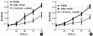 将转染LINC00339 siRNA和对照siRNA 24 h的LoVo和HCT116细胞胰酶消化后按照1×103个/孔的密度接种到96孔板中,再分别培养24、48、72和96 h,每孔加入100 μl MTT溶液,37 ℃继续孵育4 h后再加入100 μl甲臜溶解液溶解紫色结晶,然后检测各孔570 nm波长处的吸光度(A)值。