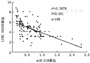 Pearson分析LINC00339与miR-218的相关性,结果如图2所示:两者在结直肠癌组织中的表达呈负相关(P<0.05)。