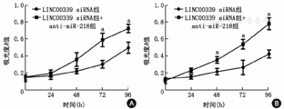 ±s表示,采用SPSS 13.0软件进行分析。两组间均数的比较采用student′s t检验,多组间均数的比较采用单因素方差分析并进行SNK检验,Pearson方法分析LINC00339与miR-218的相关性。P<0.05为差异有统计学意义。