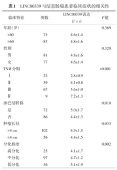 | 临床特征 | 例数 | LINC00339表达( ±s) | P值 | |