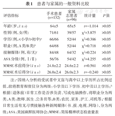 | 评估指标 | 手术患者(n=132) | 家属志愿者(n=96) | 统计量 | P值 |
