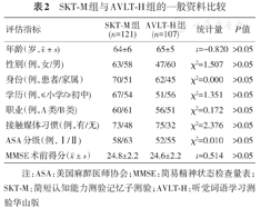 | 评估指标 | SKT-M组(n=121) | AVLT-H组(n=107) | 统计量 | P值 |