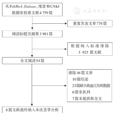 两位研究人员独立确定合格的文章。首先,对文章的标题与摘要进行初步地评估,在此步骤中要求相对广泛,以保留尽可能多的研究。其次,由两位研究人员从初步筛选的文章进行全文阅读。当信息不足,联系文章作者以获取需要的信息,若没有得到需要的信息,该文章被排除。如果同一研究不同样本多次发表暴露与结局的关联,则保留样本量最大的研究。