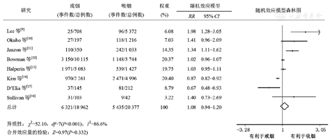 本研究也存在一定局限性,首先是关于暴露的定义,在8项队列研究中,关于戒烟有2种定义,其中5项研究根据基线是否戒烟定义,2项研究根据随访过程中是否戒烟定义,这样就无法判断在随访过程中戒烟者是持续性戒烟还是反复戒烟,可能导致戒烟对高血压发病率的有偏估计。另外,一般而言,发表与未发表的研究可能存在系统差异,研究结果为阳性的文章较容易发表,这就可能容易得到有统计学意义的结果,产生发表偏倚,影响结果的真实性。本文通过漏斗图及Egger检验对发表偏倚进行了评价,结果显示不存在明显的发表偏倚,结果较为可靠。然而,由于仅检索了英文和中文文献,语种的选择偏倚可能对结果会造成一定影响。另外,异质性检验结果发现各研究之间异质性明显,这可能与其研究设计、地域等因素有关。