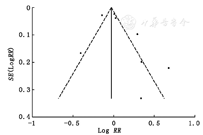 以效应量(LogRR)及其标准误[SE(LogRR)]为变量,对发表偏倚进行估计。经漏斗图(图4)及Egger法检验所得P=0.26,提示没有明显发表偏倚。