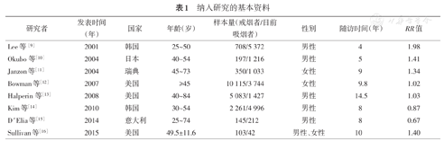 | 研究者 | 发表时间(年) | 国家 | 年龄(岁) | 样本量(戒烟者/目前吸烟者) | 性别 | 随访时间(年) | RR值 |