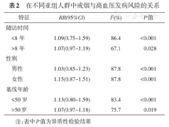 8项研究中,有5项调查对象为男性,2项为女性,1项包括男性与女性。随访的年限与基线的年龄亦存在区别。按随访时间、性别及基线年龄分亚组进行分析,结果发现在不同随访年限、不同性别及不同年龄的人群中,戒烟依然不是高血压发病的危险因素。亚组分析后,异质性未明显降低(表2)。