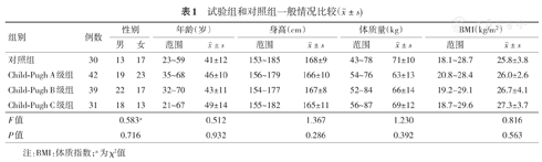 | Child-Pugh A级组 | 42 | 19 | 23 | 35~68 | 46±10 | 156~179 | 166±10 | 54~76 | 63±13 | 20.8~28.4 | 26.0±2.6 |