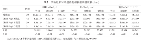 同一期相试验组较对照组容积CT剂量指数、剂量长度乘积和有效剂量均减低(F=13.354~28.192,P<0.01),其中有效剂量下降分别1.12(23.9%)、1.54(33.5%)、2.14 mSv(46.7%)。门脉期肝脏、门静脉CNR值,Child C级组较Child A级组和对照组减低分别为0.34~0.42、0.43~0.49(q=2.851~4.658,P<0.05);平扫、动脉期各组间图像主观评分差异无统计学意义。门脉期Child C级组评分均值<3分,影响诊断,且与Child A和对照组差异有统计学意义(Z=26.734~29.218,P<0.05)。