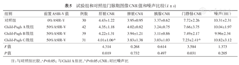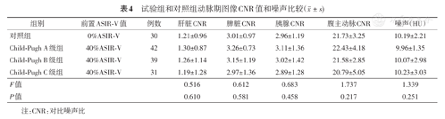 平扫和动脉期,肝脏、胰腺、脾脏、腹主动脉和门静脉的CNR值,Child-Pugh C级组较其余3组略减低,但组间差异均无统计学意义(均P>0.05)(表3,表4,表5)。门脉期肝脏、门静脉CNR值试验组和对照组间差异有统计学意义(F=4.314、3.584,P<0.05),组间两两比较,Child-Pugh C级组较Child-Pugh A级组和对照组减低分别为0.34~0.42、0.43~0.49,差异有统计学意义(q=2.851~4.658,P<0.05)。同一期相4组间图像噪声差异无统计学意义(P>0.05)。