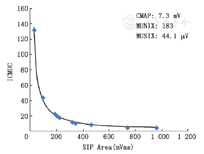 4.第三步,测量CMAP负峰波幅与SIP(表面肌电图干扰相)数值,并将此数据拷贝到Excel表中(Excel表为仪器程序表格),仪器通过数学函数自动计算MUNIX及MUSIX值,包括理想状态下运动单位计数(ideal case motor unit count,ICMUC)以及SIP面积的测量(SIP Area,单位mVms,图3)。