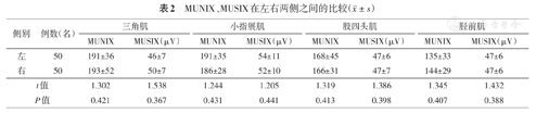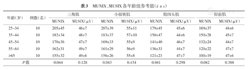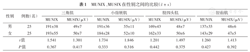 将受试者的性别和左右侧进行比较,发现各值差异无统计学意义(P>0.05,表1,表2)。说明受试者性别及左右侧别的差异不影响MUNIX、MUSIX结果的判读,因此,在以下的研究中,将性别、左右侧的结果取平均值进行讨论。