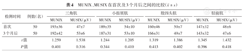 为了研究此项技术的稳定性,对相同受试者及其相同肌肉在3个月后再次检测(实验室条件同前),两次检测MUNIX值、MUSIX值均无明显改变,差异无统计学意义(P>0.05,表4)。
