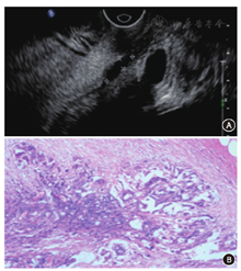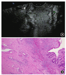 本研究中出现不同程度分期过高或过低,其中以低估较多(21例,24.4%),与文献不同[12]。回顾图像发现21例低估患者中,均为小病灶,范围在1~2 cm,可能由于病灶较小,加上新辅助治疗后,局部组织间质纤维化、组织变性,直肠壁结构紊乱,影响超声对病灶的结构分辨力[13](图1)。高估7例(8.1%,7/86),回顾图像发现,可能与病灶部位的病理改变有关,病理变化多提示为重度放疗反应,在镜下呈黏液湖、大量炎性细胞浸润(图2),超声图像中肠壁黏膜层增厚、肌层与直肠系膜分界不清,误以为是肿瘤浸润。
