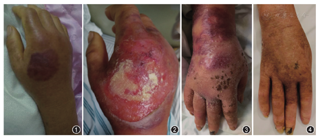 患者女,63岁,因皮肤肿胀破溃、发热2个月,指端坏疽1个月入院。2018年8月患者接触冷水后右手手背出现水肿性紫红色斑丘疹,热敷后面积增大(图1)。数日后发热,体温高峰40.2 ℃,伴畏寒、寒战。当地查血常规:白细胞13.88×109/L,中性粒细胞比例83%,血红蛋白83 g/L,余(-);肝肾功能大致正常;D-二聚体1 020 μg/L(正常范围0~232 μg/L);抗核抗体、补体及免疫球蛋白均(-)。胸部CT示左肺舌叶、下叶少许斑片影。予抗感染治疗(具体不详)后仍持续高热,右手皮疹扩大至整个手背及手腕处,伴有破溃、渗液(图2)及右上肢肿胀。行皮肤活检提示:局部糜烂形成,棘层萎缩,棘细胞内及细胞间水肿,真皮浅层水肿,血管增生,真皮全层可见弥漫性中性粒细胞伴淋巴细胞、组织细胞浸润;皮下脂肪小叶内可见中性粒细胞浸润,脂肪小叶间隔增宽,纤维化,考虑急性发热性嗜中性皮病(Sweet综合征)不除外,加用泼尼松30 mg,1次/d,但患者仍间断高热。完善感染筛查:外周血需氧、厌氧菌培养均(-);皮肤细菌、真菌、奴卡氏菌及分支杆菌培养均(-);超声心动图示各瓣膜未见明确赘生物。骨髓涂片示粒系中性分叶核比例增高,部分粒细胞核型不规则,可见巨变、内外浆,中性分叶核粒细胞可见多分叶及巨变,考虑骨髓增生异常综合征不除外;骨髓活组织检查、流式细胞检测、染色体核型及急性白血病基因分型均未见异常。2018年10月16日患者发展为双上肢皮肤肿胀、破溃,后逐渐出现右手中指、无名指、小指末端变黑。血管超声:右肘正中静脉、贵要静脉前臂远端血栓形成(急性期),右无名指、小指动脉远端闭塞,右上肢局部炎性水肿。激素改为甲泼尼龙80 mg静脉滴注,1次/d(后快速减至泼尼松25 mg,1次/d),同时先后予莫西沙星、多西环素等抗感染。患者仍间断发热,皮肤破溃有所愈合,遗留右手中指、无名指、小指末端坏疽,右上肢肿胀明显,伴疼痛。2018年11月14日为进一步诊治收入北京协和医院普通内科。患者自述每年发作1~3次痛性口腔溃疡,此次起病后口腔溃疡明显加重,反复频繁发作,否认雷诺现象及外阴溃疡。患者起病来神志清楚,精神弱,纳差,大小便正常,体质量下降约3 kg。既往史、个人史及家族史无殊。入院体格检查:双上肢肿胀,右上肢为著,右上肢臂围34 cm,右手手背见皮肤肿胀,张力高,有褐色结痂(图3)。右手中指、无名指、小指末端发黑。左侧颊黏膜可见直径约1 cm溃疡,表面覆白苔。双肺呼吸音清,心律齐。外阴未见溃疡,双下肢不肿。入院后完善检查:监测血常规:白细胞(18.24~23.53)×109/L,血红蛋白45 g/L。红细胞沉降率(ESR)111 mm/1 h,超敏C反应蛋白(hsCRP)123.08 mg/L。筛查血培养×3均(-);查血降钙素原、结核感染特异性T细胞检测、布氏杆菌凝集试验、隐球菌抗原均(-)。血管超声评估:左侧头静脉、右侧锁骨下静脉远段、右侧腋静脉、右侧肱静脉上段血栓形成。易栓全套:蛋白C、蛋白S、抗凝血酶Ⅲ、APC抵抗均未见明显异常;抗磷脂抗体谱:未见明显异常。抗核抗体、抗可提取性核抗原抗体、抗中性粒细胞胞质抗体、抗人球蛋白试验均(-);针刺试验(-)。眼科会诊:眼底未见异常。躯干正电子发射计算机断层显像(PET/CT):脾脏代谢略增高(SUVmax 3.1),中央骨髓、双侧肩胛骨、股骨上段代谢弥漫性不均匀增高(SUVmax 5.6);右前臂背侧及右上臂皮肤及皮下软组织代谢不均匀增高(SUVmax 5.3),余无异常。入院后激素加量为甲泼尼龙40 mg静脉滴注,1次/12 h,低分子肝素4 000 U皮下注射,1次/12 h。患者仍间断于清晨、傍晚每次激素输液前出现中高热,伴右上肢反复发作性红、肿及疼痛加重,监测ESR 93~104 mm/1 h,hsCRP 82.0~140.54 mg/L。经普通内科疑难病多科查房后,结合患者反复痛性口腔溃疡、动静脉血栓形成、皮肤病变符合Sweet综合征表现,考虑诊断为白塞氏病,骨髓改变为继发表现。给予环磷酰胺0.2 g静脉推注、1次/隔日,但患者体温及右上肢肿胀、疼痛控制不佳,复查ESR>140 mm/1 h,hsCRP 190.20 mg/L,考虑炎症控制不佳。遂给予甲泼尼龙静脉滴注1 g/d,连续3 d冲击治疗,期间患者体温正常,右上肢肿胀明显减轻,但序贯改为甲泼尼龙40 mg静脉滴注,1次/12 h后患者再次发热,复查ESR 63 mm/h,hsCRP 94.29 mg/L,考虑炎症控制仍不理想,给予环磷酰胺1 g静脉输液1次冲击治疗。但治疗后监测白细胞由30.63×109/L降至3.86×109/L,血红蛋白由74 g/L降至57 g/L,血小板由127×109/L降至48×109/L。考虑患者年龄大,无法耐受大剂量的环磷酰胺治疗,遂将免疫抑制剂调整为他克莫司1 mg口服,1次/12 h,根据白细胞情况给予1周1次或2次环磷酰胺0.2 g静脉推注。治疗后患者发热及右上肢发作性肿胀加重间期逐渐延长,右上肢臂围逐渐缩小,右手背皮肤破溃结痂愈合。2019年2月随访患者,激素减量至甲泼尼龙20 mg口服,1次/d,未再发热,右上肢臂围明显缩小(36➝25 cm),无局部红肿热痛,右手背肿胀消失,遗留色素沉着(图4)。复查血常规:白细胞7.57×109/L,血红蛋白79 g/L,血小板150×109/L;ESR 29 mm/1 h,hsCRP 15 mg/L。最终诊断:白塞病,右上肢深静脉血栓,右手指端坏疽。