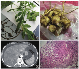 注:图1A示菊三七植株,图1B示其根茎;图2示肝脏形态尚可,肝实质密度不均,增强扫描肝实质强化不均并减低、延迟,呈"龟背样"强化,肝左、肝中、肝右静脉显示不清;图3示肝小叶中央周边部分肝索萎缩,肝窦明显扩张,部分脉管管壁增厚,管腔略扩张,不除外静脉闭塞性疾病改变,汇管区可见炎细胞浸润,部分肝细胞变性,伴点状坏死,广泛淤胆
