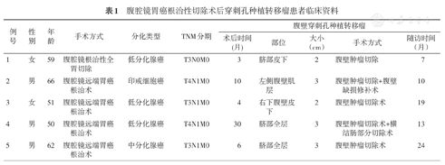回顾性总结分析2014年1月至2018年1月浙江省人民医院收治的5例腹腔镜胃癌根治性切除术后穿刺孔种植转移患者资料和随访资料。