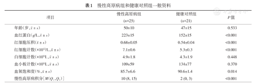 | 项目 | 慢性高原病组(n=25) | 健康对照组(n=21) | P值 |