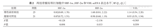 两组骨髓有核红细胞中HIF-1α,HIF-2α和VHL mRNA表达水平[M(Q1,Q3)]