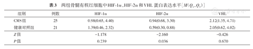 以2016年1月至2017年12月在青海大学附属医院就诊的25例CMS患者及21例健康对照人群为研究对象,免疫磁珠分选出CD71+CD235a+的骨髓有核红细胞,实时荧光定量PCR法以及Western印迹法分别测定骨髓有核红细胞HIF-1α、HIF-2α以及VHL mRNA和蛋白表达水平并进行比较,了解各指标的变化及相互关系。