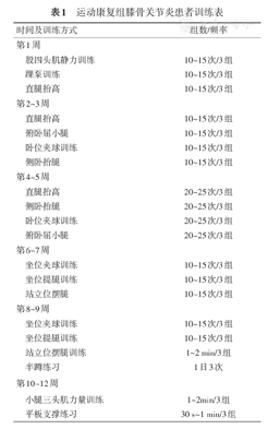 以往研究均只侧重于单一运动方式,例如肌肉力量训练或进行平衡能力训练,且未明确患者的运动强度及频率[15,16]。而本研究对KOA患者制定详细的系统化运动康复方案,确定了KOA患者适宜的运动方式及运动频率,并对其进行对照试验判断对患者短期预后的影响,从而阐明了KOA患者应如何进行运动训练及对患者康复的必要性。