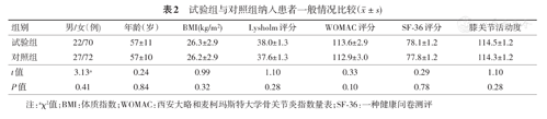 两组随访时间(12.0±2.3)周,失访19例(9.0%),最终参与试验患者191例,其中试验组92例,男22例,女70例,平均年龄(57±11)岁;对照组99例,男27例,女72例,平均年龄(57±10)岁。两组患者的年龄、性别、体质指数(BMI)、Lysholm评分、WOMAC评分、SF-36评分和膝关节活动度差异均无统计学意义,具有可比性(表2)。