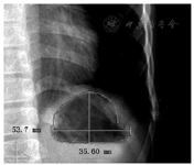 (1)检查方法:立位胸部平片检查体位采用后前位,摄片仪器为德国西门子DR机(Axiom Aristos VX),胸片拍摄条件为电压125 kV,1.26 mAs,胶片距1.8 m,自动调节曝光时间,在患者吸气后屏气时进行自动曝光。(2)结果判读:根据入选标准和排除标准将符合标准的初选病例的ID号和胸片拍摄日期分别提供给1名耳鼻喉科和1名消化科高年资主治医师,通过医院PACS系统(Synapse,FUJIFILM公司)调出胸片图像,调节窗宽、窗位,使胸片上的胃泡达到最佳的视觉效果,然后使用内置测量工具对胃泡高度、宽度以及面积进行测量(图1),测量前对两人进行判读标准的培训,且规定胸片上未见胃泡的病例以上三个测量数据均设为0(mm或mm2)。对两人认为存在间位结肠的原因导致胃泡无法准确测量的病例予以集中讨论后排除。取两者测量平均值纳入统计。