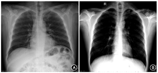 注:A示存在间位结肠,影响胃泡判读;B示立位胸部平片中未见胃泡