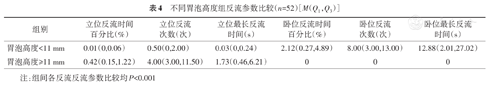 比较病例组高低胃泡两组间的pH监测的反流参数,包括立卧位反流时间百分比、反流次数和最长反流时间。比较结果显示两组间上述数据间差异均有统计学意义(均P<0.001),其中低胃泡组的卧位反流参数均显著高于高胃泡组,高胃泡组的立位反流参数均显著高于低胃泡组(表4)。