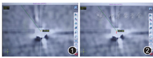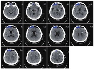 所有入组病例均于术后2 h和术后1周复查头部三维重建,将术后CT图像传输至ROSA计算机工作站中,并与术前CT融合,在"Axial(AC-PC)"图像上选取靶点平面,计算植入电极中心位置与手术计划相对应靶点在X轴和Y轴上的偏差距离。ICA体积由术后2 h复查CT逐层测量相加得出(图1,图2,图3)。