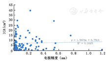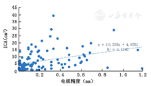 第二侧电极中113例患者发生1CA,第二侧植入电极X轴的误差变化△X2(0~1.19)mm,平均(0.16±0.19)mm,对应1CA体积(0.05~38.2)cm3,平均(5.97±7.24)cm3,差异无统计学意义(r=0.009,P>0.05);Y轴的误差变化△Y2(0~1.4)mm,平均(0.23±0.21)mm,差异有统计学意义(r=0.513,P<0.05),图6,图7。