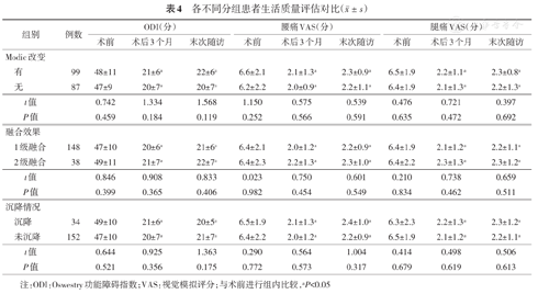 1级和2级融合患者、沉降和未沉降患者以及Modic改变组和无Modic改变组间的ODI和VAS评分,无论是术前、术后,还是末次随访时对比差异均无统计学意义。所有患者术后3个月及末次随访时ODI和VAS评分均较术前明显改善(均P<0.05)(表4)。