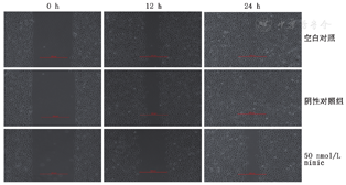 将处于对数生长期的HUVEC种于6孔板(0.5~1.5×106个/孔),培养箱(37℃、5%CO2)中培养约24 h后,进行转染(miR-106a-5p mimic及negative control);转染8~12 h后,予10%FBS DMEM培养;至细胞密度达95%~100%时,更换1%FBS DMEM饥饿24 h;以200 μl无菌枪头,在每孔纵向划痕;弃去旧培养基,更换10%FBS DMEM完全培养基,在0、6、12、24h时于倒置荧光显微镜(白光)下观察拍照倒置。