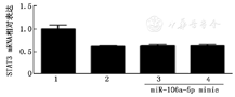miR-106a-5p(previous ID:miR-106a)的碱基序列为AAAAGUGC UUACAGUGCAGGUAG,通过TargetScan、miRBase等数据库预测发现,STAT3具有3个能够与miR-106a-5p碱基互补(UUUCACG)的位点(158~164、448~454、623~629),提示STAT3可能是miR-106a-5p的靶基因。构建含有目的DNA片段(STAT3)的野生载体及突变载体(GCACTTT突变为CGTGAAA),其中突变载体含有上述3个位点的突变:将靶序列位点一:GCACTTT突变为CGTGAAA(252~258)、位点二:GCACTTT突变为CGTGAAA(542~548)、位点三:GCACTTT突变为CGTGAAA(717~723)。共转染miR-106a-5p模拟物和野生型STAT3 3′UTR质粒后(WT-STAT3 3′UTR),HEK 293细胞的荧光素酶活性降低(3.148/1.782),差异有统计学意义(F=7.837,P<0.05);共转染miR-106a-5p mimic和突变型STAT3 3′UTR质粒后(MUT-STAT3 3′UTR),HEK 293细胞的荧光素酶活性无明显改变(F=1.980,P>0.05),因此miR-106a-5p的靶基因可能为STAT3。共转染miR-106a-5p模拟物和野生型STAT3 3′UTR质粒后HEK293细胞的荧光素酶活性降低。