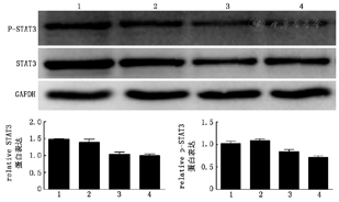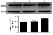 miR-106a-5p模拟物(50、100 nmol/L)抑制STAT3的蛋白表达(F=11.16,P<0.01),同时STAT3磷酸化形式p-STAT3的蛋白表达亦下调(F=6.305,P<0.05)(图5)。而miR-106a-5p抑制物可上调STAT3的蛋白表达(F=19.70,P<0.01)(图6)。