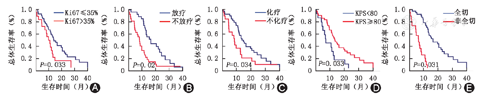 Ki67指数≤35%的亚组2年OS为18.4%,>35%亚组为11.8%。Ki67指数对患者2年OS有显著影响,P=0.033,图1A。是否放疗(P=0.002,图1B)、是否化疗(P=0.034,图1C)、KPS评分(P=0.008,图1D)和切除程度(P<0.001,图1E)对患者预后均有显著影响。术后进行辅助放化疗、KPS评分更高、接受肿瘤全切的患者预后更好。而性别(P=0.467)对患者生存预后无显著影响。
