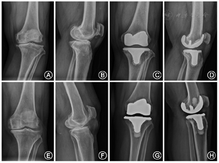 回顾性分析患者术前西安大略和麦克马斯特大学骨关节炎指数评分(WOMAC)、膝关节协会评分(KSS)、膝关节活动度(ROM),采用门诊复查及电话随访的方式获得术后末次KSS评分、WOMAC评分、膝关节ROM,人工关节被遗忘指数(FJS)。