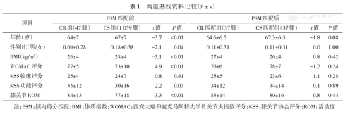 匹配前,1 106膝获得平均(48±16)个月随访,其中CR组47膝,CS组1 059膝;两组除KSS临床评分差异无统计学意义外(分别为25±4和24±7,t=0.82,P=0.41),其余指标如年龄、性别、BMI及术前WOMAC、术前KSS功能评分、术前膝关节ROM差异均有统计学意义(均P<0.05)。通过1∶1 PSM后获得的37膝CR匹配组与37膝CS匹配组,比较两组基本资料,在年龄、性别、BMI及术前WOMAC、术前KSS临床评分、术前KSS功能评分、术前膝关节ROM等各指标差异均无统计学差异(均P>0.05),两组具有可比性(表1)。
