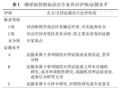 证据评价:专家组参考了改善全球肾脏病预后组织(KDIGO)等指南的推荐及证据分级标准,结合我国临床实践进行简化,将推荐等级分为3个等级,证据水平分为3个水平(表1),并按照DKD危险因素、诊断、治疗等分章节进行推荐,并给出相应的证据陈述。