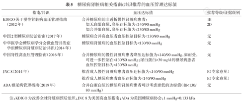 | 中华医学会糖尿病学分会微血管并发症学组糖尿病肾脏病防治共识(2014年) | 糖尿病肾脏病的血压控制目标为<130/80 mmHg | 无 | |