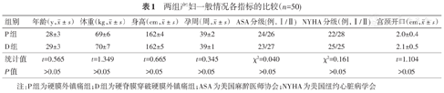 注:P组为硬膜外镇痛组;D组为硬脊膜穿破硬膜外镇痛组;ASA为美国麻醉医师协会;NYHA为美国纽约心脏病学会