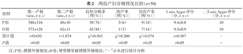 两组产妇分娩过程中及分娩后各指标的比较(n=50)