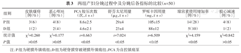 注:P组为硬膜外镇痛组;D组为硬脊膜穿破硬膜外镇痛组;PCA为自控镇痛泵