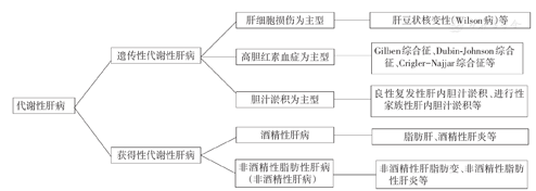近年来,由于疫苗接种的普及、抗病毒新药的不断涌现,病毒性肝炎已得到基本控制。我国一项纳入2006至2014年间医院感染病科11 720例肝病住院患者资料的回顾性分析显示,病毒性肝炎比例连续9年持续下降[1]。同期,因生活方式改变如饮食不当、酗酒、活动减少和静坐、工作压力等,肥胖和代谢综合征流行。目前,临床上非病毒性肝炎的肝病患者呈快速持续增长。值得重视的是,这一类型肝病与病毒性肝炎肝病两者在多个方面性质不同:(1)前者为非传染性疾病,后者是传染性疾病;(2)前者是慢性疾病,鲜有急性发病者,后者包括急性和慢性两种病程;(3)前者致病因素多且不明确,后者有明确致病因素。两种疾病临床上的诊断和治疗思路,也包括对疾病的管理路径截然不同,有必要加深认识以利防治。本文重点探讨与多种代谢因素相关的慢性非传染性肝病,也因为此类疾病由代谢因素引起,故提出代谢性肝病的概念(图1),即由于各种代谢因素引起的肝脏病变。基于其发病机制不同,分为遗传性代谢性肝病和获得性代谢性肝病,后者又根据是否与乙醇(酒精)摄入相关分为酒精性肝病(alcoholic liver disease,ALD)和非酒精性脂肪性肝病(non-alcoholic fatty liver disease,NAFLD)。