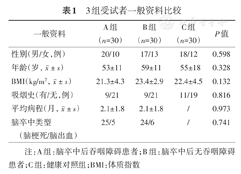 注:A组:脑卒中后吞咽障碍患者;B组:脑卒中后无吞咽障碍患者;C组:健康对照组;BMI:体质指数