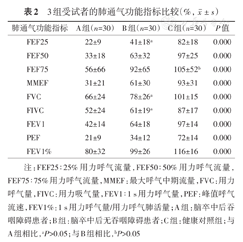 | 肺通气功能指标 | A组(n=30) | B组(n=30) | C组(n=30) | P值 |