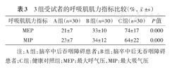3组间的呼吸肌肌力差异有统计学意义(P<0.05),各指标均显示C组>B组>A组。各指标的组间两两比较差异均有统计学意义(P<0.05,表3)。